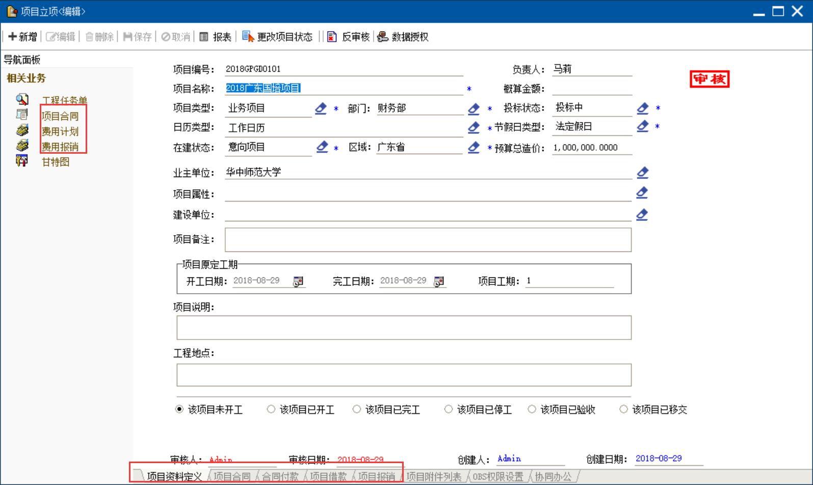 记录项目的基本信息,可实现根据省份对全国项目信息进行管理,包括增加、删除、修改、查询等操作。并且根据项目库查询,动态,直观的显示所有项目的合同,资金情况。