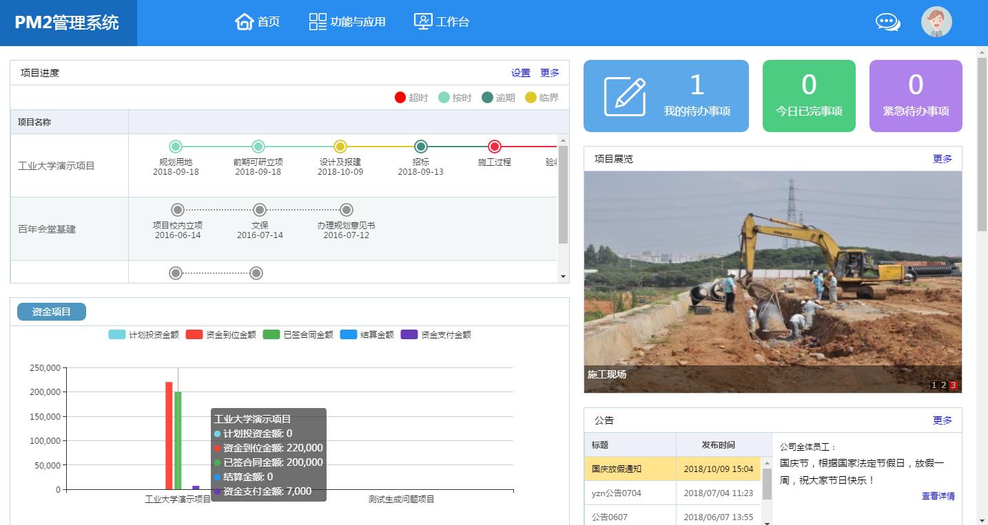 包括项目红绿灯、综合指标分析等功能,以最人性化的直观图形界面,方便学校和基建处领导查看分析各个项目的总体进度情况,包括项目概况、项目进度与阶段性成果、投资完成情况及指标分析、签约与资金支付情况、形象进度与现场日志、待办工作与风险点提醒等,为各级领导提供决策支持。