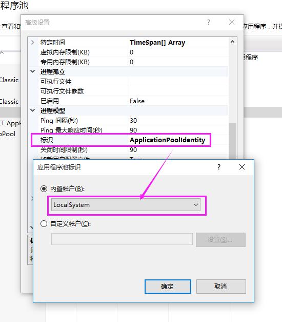 选择绑定的应用池右键->“高级设置”,将"进程模型"的标识用户,改为“LocalSystem”,然后重启应用池。