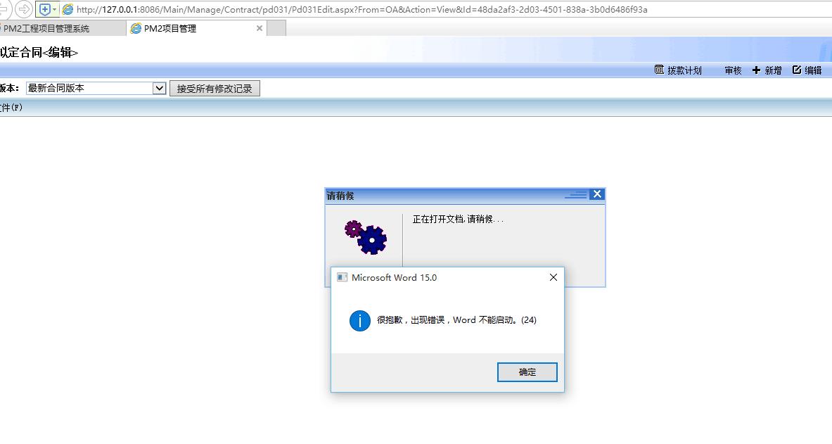 问:带有office控件,打开时报错,“很抱歉,出现错误,Word不能启动。(24)”,如下图
