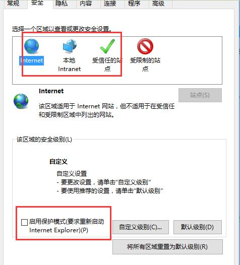 解决方法:打开IE选项,在取消IE保护模式,请看下图