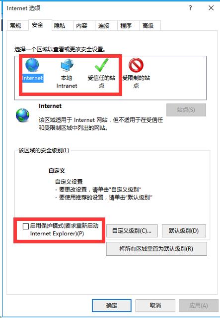 答:原因是被IE的启用保护模式阻止了,需要不启用保护模式和把网止加载到受信用网站