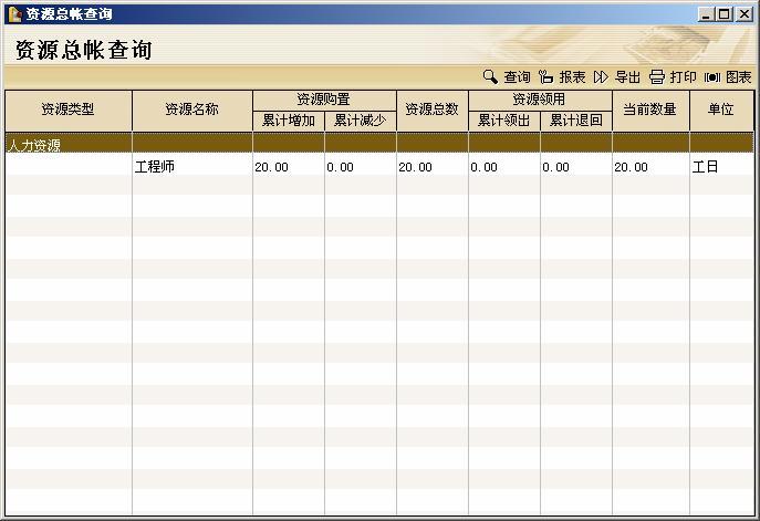 资源总帐查询、项目资源帐查询、任务资源帐查询、资源增加明细查询、资源减少明细查询、资源领出明细查询、资源退回明细查询、项目资源负荷查询