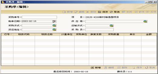 采购管理子系统包括供应商管理、采购计划、采购业务等模块,通过对项目物资需求的分析自动生成物资需求计划、物资采购计划、项目物质需求计划、任务物资需求计划、物资需求项目分布和物资需求任务分布,全面反映项目的物资采购需求,以此为基础合理安排物资采购;同时也提供了对物资供应商和具体采购业务的管理功能。