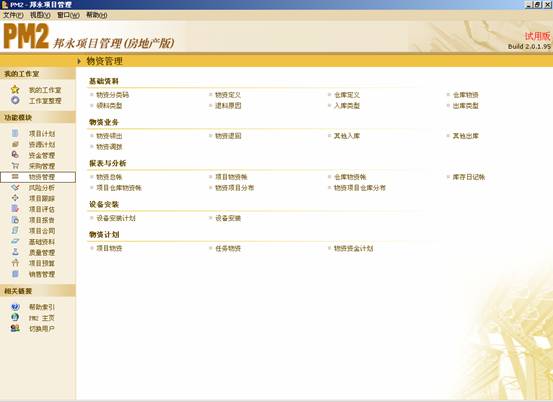 物资管理子系统由物资业务、报表与分析、设备安装和物资计划等模块构成,在定义了物资类型、具体物资和仓库后,通过对物资领出、物资退回、其他入库、其他出库和物资调拨的管理,自动生成物资总帐、项目物资帐、仓库物资帐、库存日记帐、项目仓库物资帐、物资项目分布和物资项目仓库分布,全面反映项目中物资的使用情况,为在项目中合理分配物资提供决策依据;同时,物资资金计划反映了物资采购的资金需求,以便及时为物资采购调拨资金。