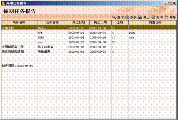 项目报告子系统将项目执行过程中常用的、需特别关注的项目信息汇集生成项目报告,便于项目高层领导和管理人员掌握项目总体信息,它包括项目/任务摘要报告、关键任务报告、里程碑任务报告、即将开工任务报告、拖期任务报告、任务计划调整报告、项目/任务管理机构图表等具体内容。