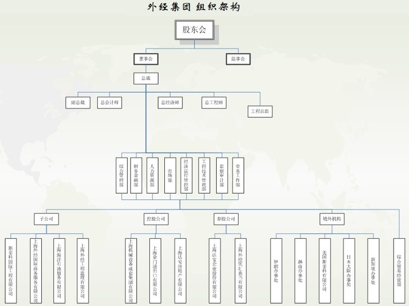 中国上海外经(集团)有限公司是经国家商务部(前外经贸部)和上海市人民政府批准成立的综合涉外国有企业。净资产近8亿人民币,总资产35亿人民币,拥有6家全资子公司、3家控股公司和10个常驻境外机构,业务涉及138个国家或地区。集团以国际工程承包为核心业务,主要有五大产品:民用房屋土木工程、工业成套设备工程、现代农业工程、工程配套咨询、工程配套服务贸易。其中,成套设备工程是我集团五大拳头产品之一,分别承接了缅甸照济电站、蒙古都日根电站、越南山洞电站、泰国BNS钢厂、巴基斯坦液化气储罐等超过600个项目。